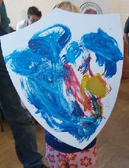 Our third event was the Ash Heritage Centre Tenth Anniversary Celebration on 26th September, held at Ash Village Hall. This lovely village event gave us the chance to practice some of the heritage learning activities for children of varying ages. For the youngest it was a chance to make salt-dough animals (a sensory activity also suited to children on the autistic spectrum). Penny had painted some examples including bees, dragons, and a hedgehog. We also provided our popular badge-making and decorated shells. These were sturdy scallop shells, symbols of medieval pilgrimage as well as links to our Kentish coast. Another activity was cardboard shield painting based on examples of canting animal heraldry in the Dering Roll (British Library Add. 77720, c. 1270-1280). The Roll of shields of Kent and Sussex families was possibly made for the Constable of Dover Castle, Stephen of Pencester. Examples of animal allusions include Nicholas le Lou’s shield with two wolves (Old French ‘lou’ means wolf) and Henry de Herice whose shield bore three hedgehogs as ‘herice’ was Old French for hedgehog. One teenager drew a shield featuring bees and a two-year-old painted a wonderful blue dragon with a red tongue.